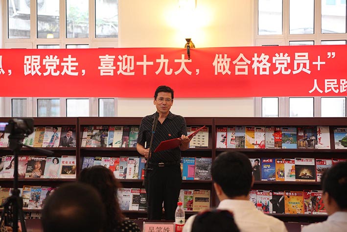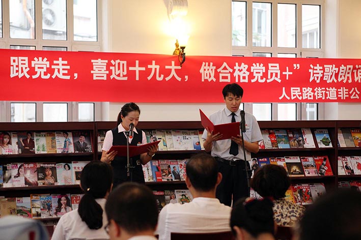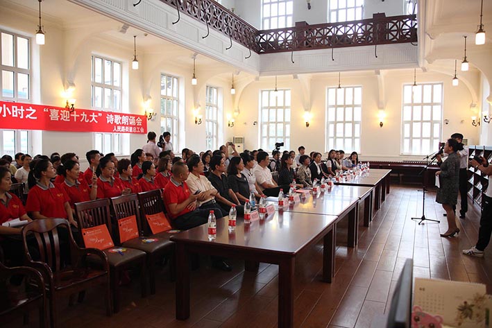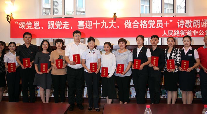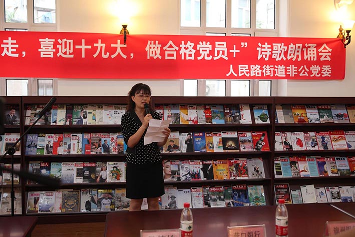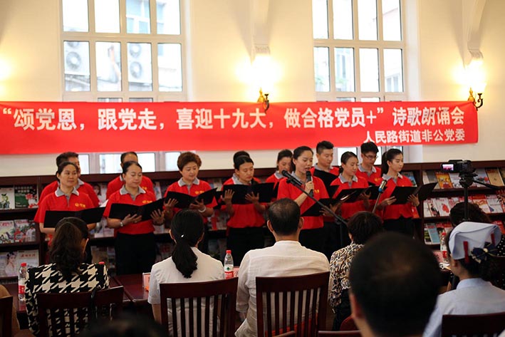 为迎接中华人民共和国成立68周年及党的第十九次代表大会召开,人民路街道非公党委联合大连图书馆鲁迅路分馆共同举办了“颂党恩,跟党走,喜迎十九大,做合格党员+”诗歌朗诵会,迈克集团党委参加了本次活动。