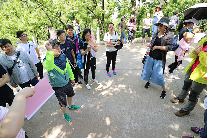 游戏过后,爬山环节正式开始,沿着起伏的山路大家一路前行,景色也愈加秀丽,满眼的翠绿令人心旷神怡。一路来到了大黑山山城—卑沙城,这座曾是军事古城堡虽已没有了军事的意义,但历史的痕迹却依旧值得我们去凭吊,更有了解历史的同事们为大家进行了详细的讲解。